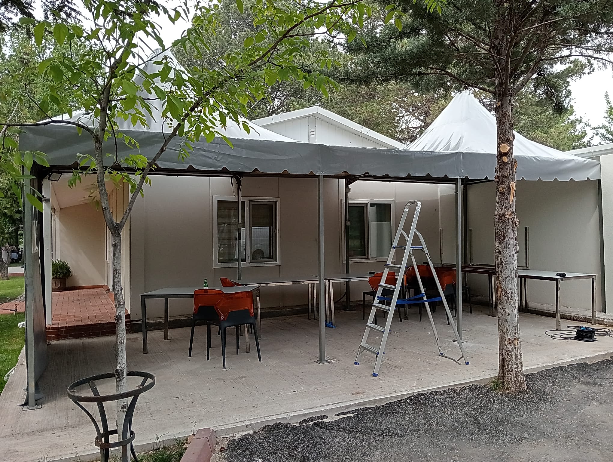 Üretilen çadırlar, profesyonel ekipler tarafından kuruluma hazırlanır. Montaj aşamasında: